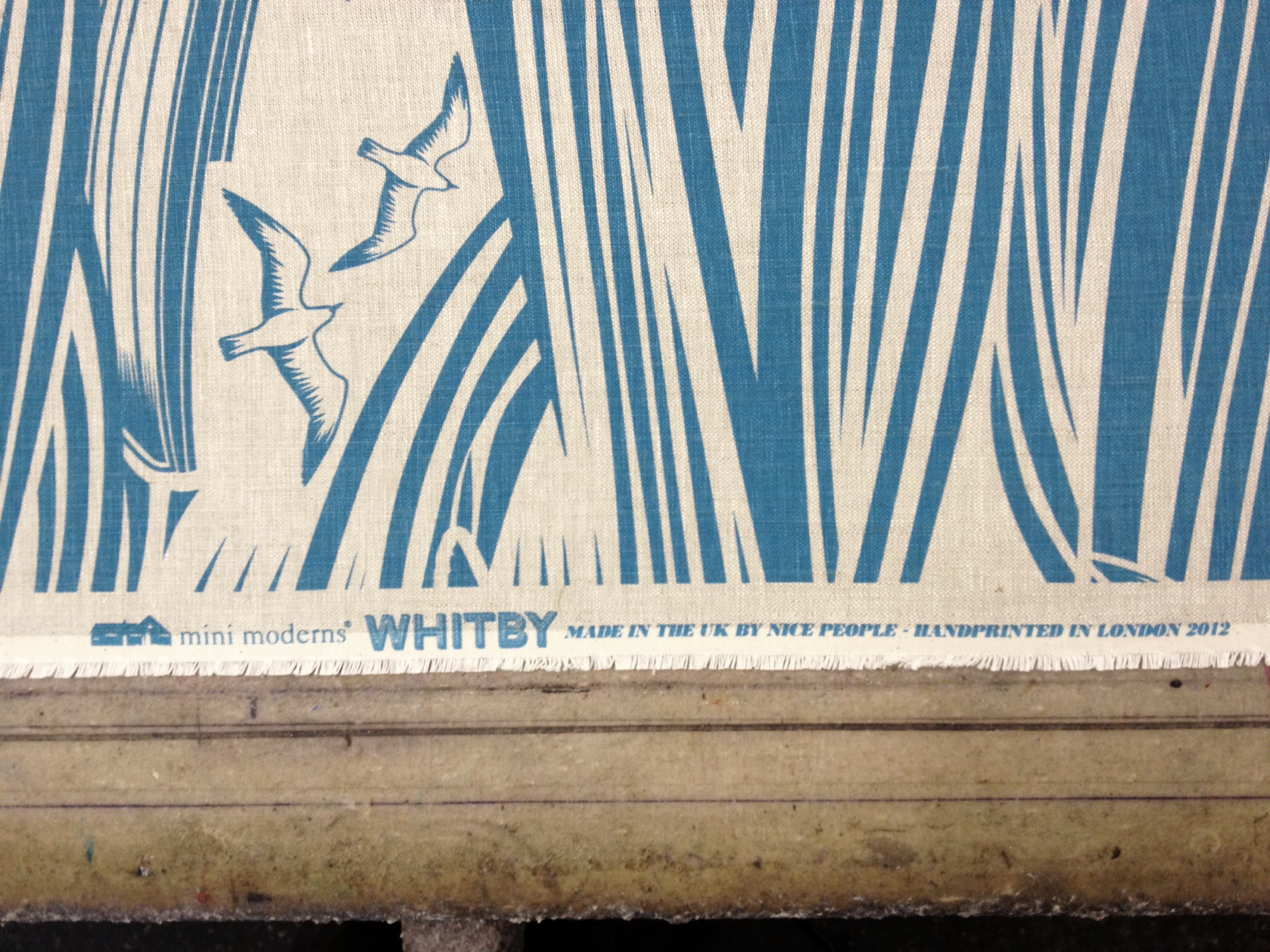 We are really excited to finally be producing our Whitby design as fabric to be sold by the metre exclusively at http://www.minimoderns.com. the fabric is printed on beautiful quality Linen Union oatmeal fabric – which gives the pattern a vintage look and has a synergy with the existing best selling wallpaper. The fabric will be available in 3 colourways Stone, washed denim (pictured) and Lido.
