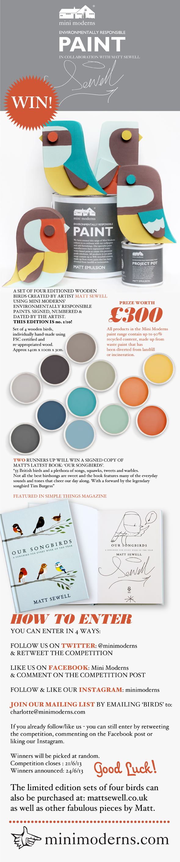 Brilliantly talented artist and author, Matt Sewell has created a limited edition set of four hand-crafted wooden birds, decorated using Mini Moderns Environmentally Responsible Paints. You can win a signed numbered and dated set of four birds, worth £300, or a signed copy of his latest book, by entering our competition – details below.mattandminimodrns