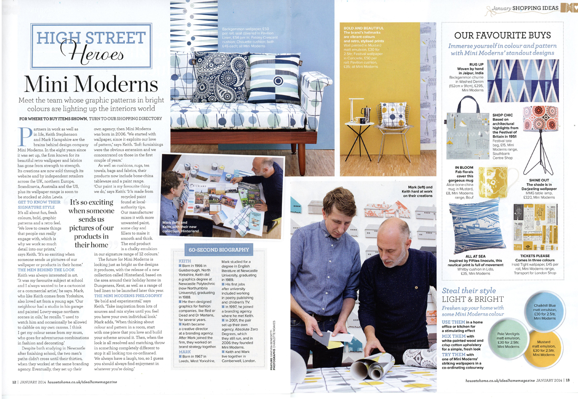 January Ideal Home magazine picked us for their High Street Heroes section of the magazine. Featuring an interview with Mark and Keith as well as lots of products and where to buy them. There is also a picture of Mini Moderns with their mood board for their Dungeness wallpaper from the forthcoming collection ‘Hinterland’