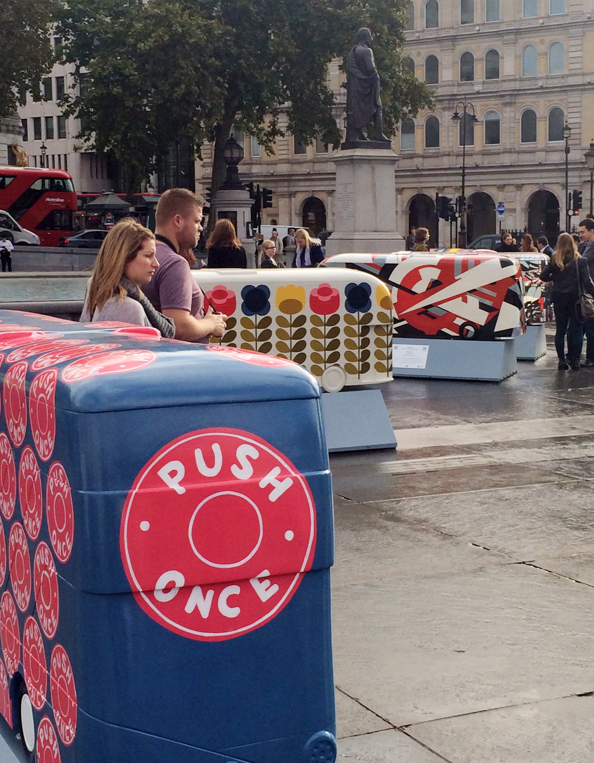 To celebrate 2014 Year of the Bus, Transport for London teamed up with Wild in Art to create a series of the new Thomas Heatherwick Routemaster sculptures as a bus trail around London. We are very proud to say that included in the 60 sculptures created by artists and designers, are two Mini Moderns designs. Some of you may recognise our ‘Hold Tight’ wallpaper design, faithfully reproduced by hand by Jane Headford. Our other design, based on our Year of the Bus product ranges for London Transport Museum, is ‘Push Once’which was realised for us by artist Sophie Green.