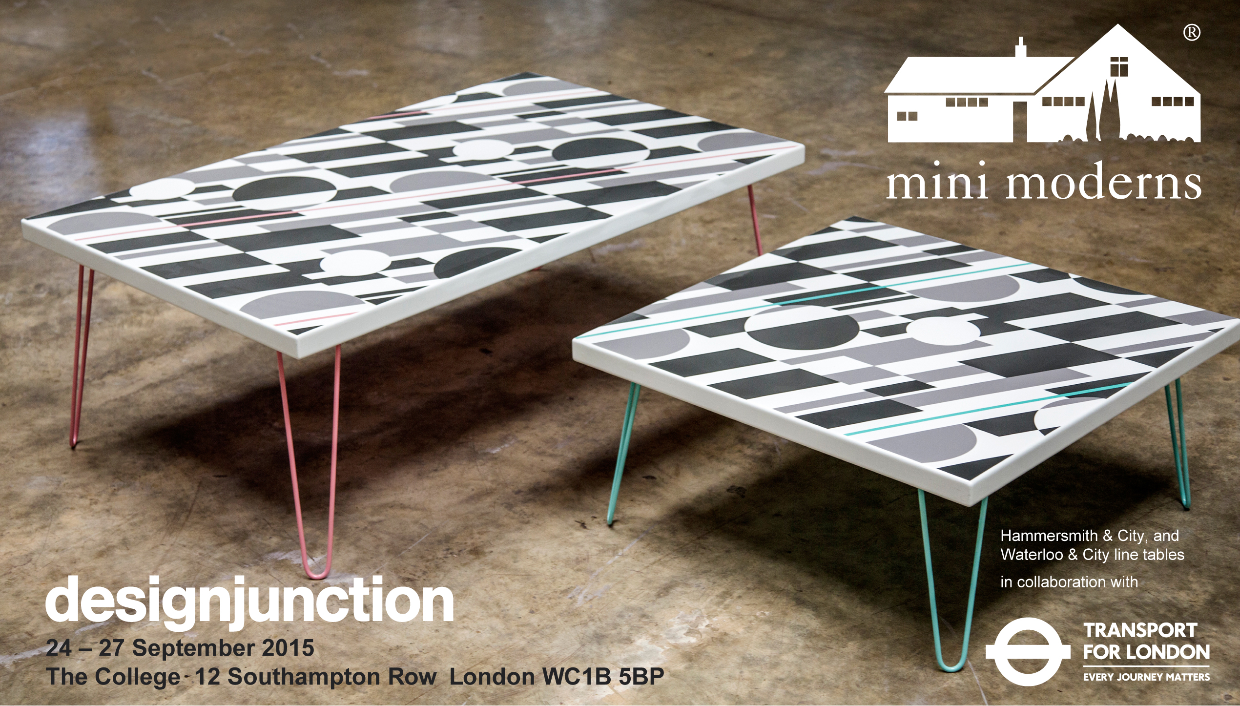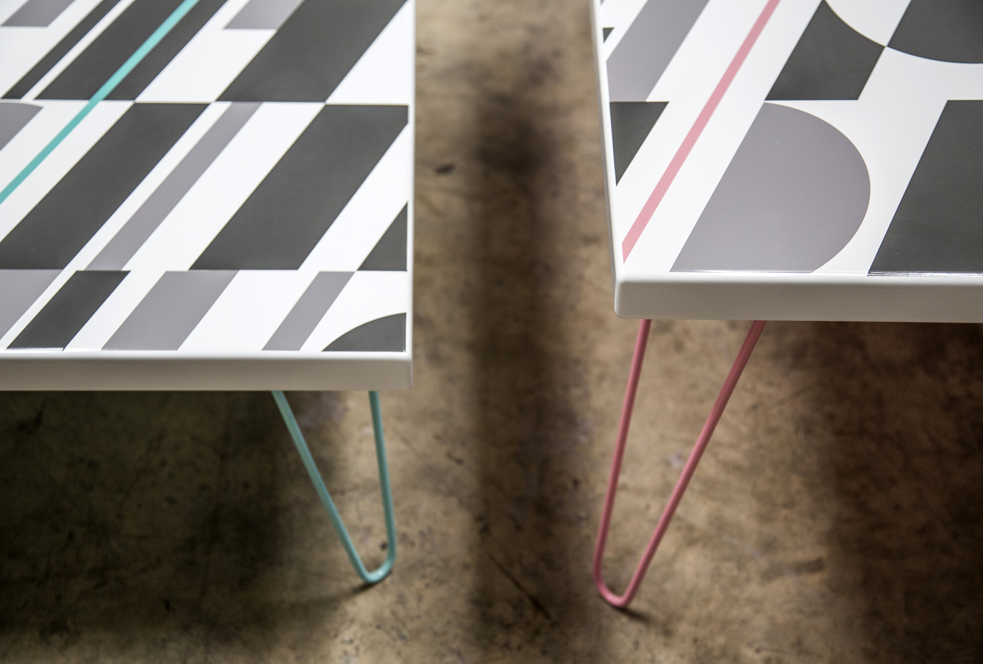 The screen printed enamel topped tables feature one of Mini Moderns’ latest print designs, P.L.U.T.O., which has been recoloured exclusively for TFL. The original print transformed into a totally different concept once we introduced the diagonal colour cutting through the design, in the line colours of the Hammersmith and City , and Waterloo and City line. The abstract shapes too – once recoloured in tonal greys, suggest the London Underground tunnels, or an abstract version of Transport For London’s classic roundel branding. The hairpin legs were created in the line colours too to make the Underground the hero of the design.
